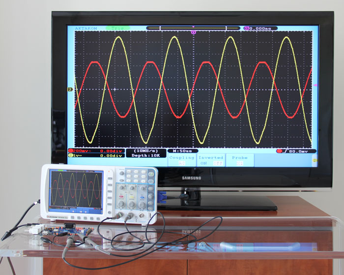 Чтобы корректно устанавливать режим сбора данных цифрового осциллографа следует придерживаться простого правила: частота дискретизации должна быть по крайней мере в 5-10 раз выше частоты сигнала, тогда у вас не будет парадоксов, которые наблюдаются на втором экране.