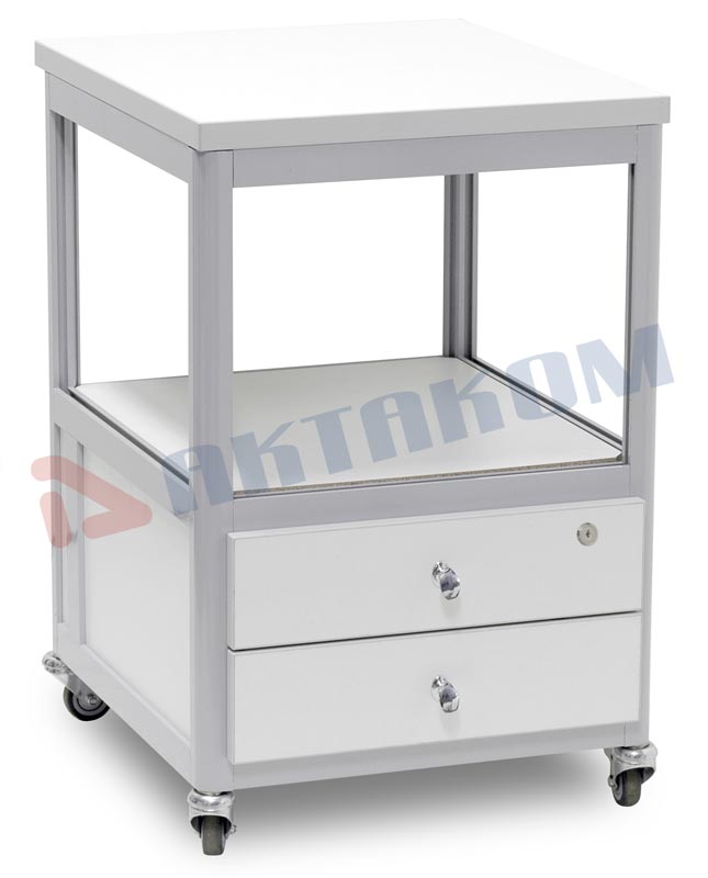 Тумбочка подкатная с двумя ящиками и полкой. Цвет алюминиевого каркаса – коричневый (8017), цвет ДСП - белый. Два выдвижных ящика с лицевыми панелями, один с замком, одна полка 40х40 см, четыре колеса, два из них блокируемые. Стенок вокруг полки нет. Габариты 43х50х66 см.