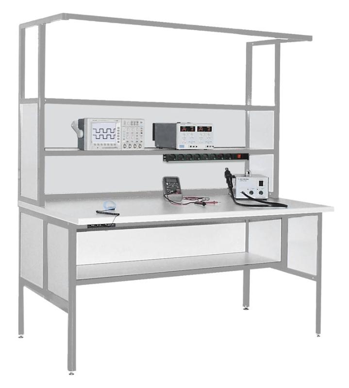 Стол регулировщика радиоаппаратуры 100 х 80 х 171 см. Цвет алюминиевого каркаса - серый (RAL-9006), цвет ДСП - белый. Две полки 100 х 30 см с задней стенкой над столешницей. В стандартной модификации полки фиксированы по высоте, но их можно передвинуть вверх на нужное расстояние (при этом будут просветы между ДСП и профилем). Одна полка 100 х 30 см с глухой задней стенкой под столешницей. Кронштейн-штанга по всей ширине стола. Светодиодный светильник 10 Вт, блок из 8 розеток с выключателем, разъемы заземления. Расстояние от столешницы до пола 750 мм с регулировкой опорами +10 мм.