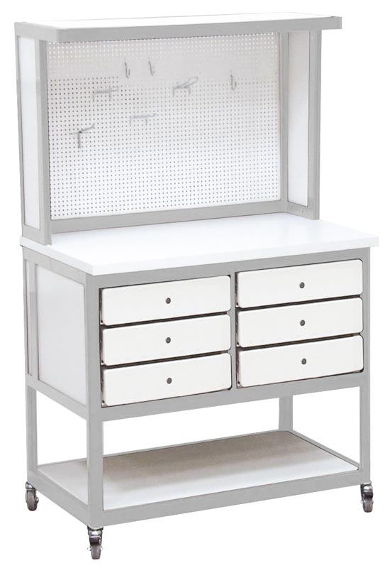 Стойка инструментальная АРМ-2581-9 представляет собой отдельно стоящий мини-верстак, что является компактным и практичным решением для работы с приборами, деталями и инструментом. Стойка АРМ-2581-9 станет отличным дополнением для рабочего места на производственных предприятиях, в ремонтных мастерских, а также в электроизмерительных и метрологических лабораториях. Цвет каркаса из алюминиевого профиля – серый (RAL 9006), цвет ДСП – белый. На стойке расположены шесть вместительных выдвижных ящиков разных размеров, что позволяет хранить в них различные инструменты, комплектующие и аксессуары. Полка над столешницей позволяет размещать дополнительные приборы, используемые в работе. Стойка оборудована линейным светильником дневного света, который обеспечивает равномерное освещение рабочей поверхности. Перфорированная задняя стенка с набором крючков типа АРТ-9ХХХ позволяет закрепить различный инструмент, чтобы он всегда был под рукой. Мини-верстaк оснащен четырьмя опорными колесами, два из которых имеют блокировку. Это обеспечивает надежную фиксацию стойки на месте и облегчает её перемещение при необходимости. Вопросы и ответы